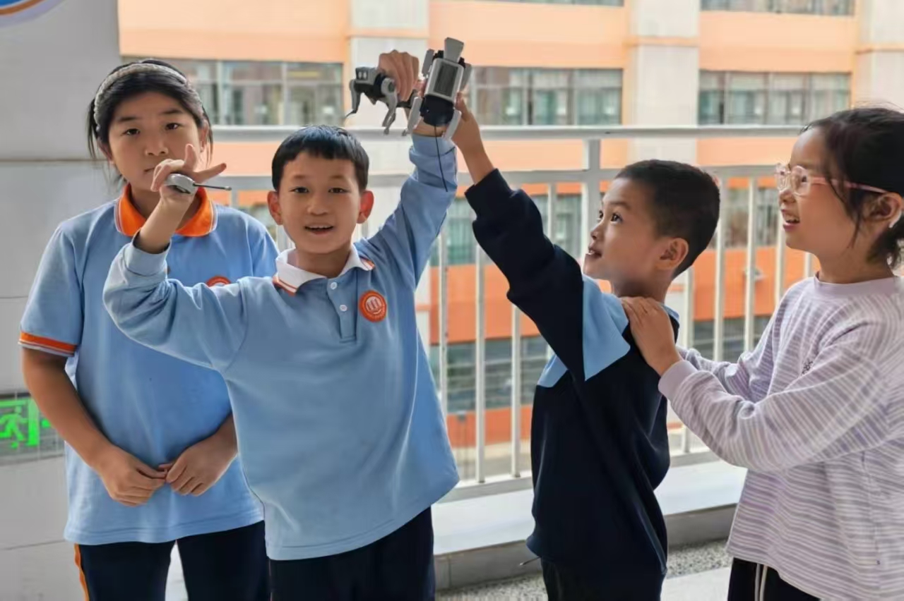 课堂还开展了一场热闹的“机械狗拼装大赛”,同学们两人一组,拿着拼装套件,对照说明书分工合作,有的负责安装“腿部关节”,有的专注连接 “传感器线路”……在团队老师的指导下,经过同学们的一番努力,一个个小巧的机械狗模型顺利完成,并兴致勃勃地进行了遥控机械狗赛跑。