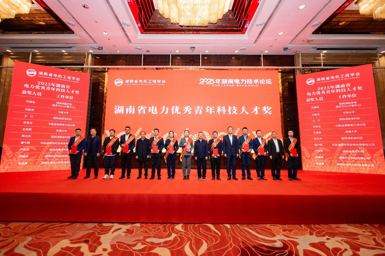 本次论坛由湖南省电机工程学会主办,以“共绘电力发展蓝图,推动绿色低碳转型”为主题,于12月25日在长沙顺利召开。论坛汇聚了包括中国工程院院士、省市级相关领导、电力行业专家学者在内的各界代表,现场颁发了2025年度湖南省电力科学技术奖及优秀论文奖。湖南省电力科学技术奖评选程序严格,经由形式审查、专家组初评、评审委员会终审等多轮环节综合评定产生,其中“湖南省电力优秀青年科技人才奖”全省仅授予10人。